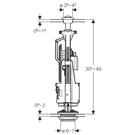 Technické informace Maximální teplota skladování 40 °C Maximální teplota vody 25 °C Velké splachovací množství, rozsah nastavení 6–9 l Malé splachovací množství, rozsah nastavení 3–4,5 l Ovládací síla 18 N