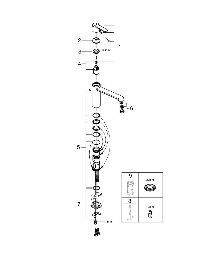 Hlavní funkce středně vysoký výtok Keramická kartuše GROHE SilkMove 35 mm jednootvorová instalace povrch GROHE Long-Life variabilně nastavitelný omezovač průtoku otočná trubková výpusť rozsah otáčení 140° Výtoková trubice s mousseur Flexibilní připojovací hadice Rychloupínací systém GROHE FastFixation Nástroj GROHE QuickTool je součástí dodávky
