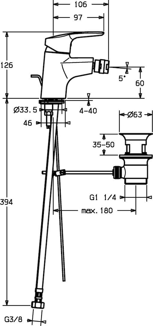 Vlastnosti Provzdušňovač PCA® aerátor s konstatním průtokovým množstvím nezávislým na změnách tlaku, Aerator s kloubovým čepem a možností nastavení směru proudu vody Připojení Flexibilní připojovací hadice Rozšíření Mechanický uzávěr odpadu s táhlem Páka/rukojeť Páka se symboly teplé a studené vody, Jedna ovládací páka / rukojeť Speciální vlastnosti Tělo baterie z mosazi DZR Výtok Pevné výtokové rameno Barva Chrom Vlastnosti průtoku Průtok při 3 barech (s regulátorem průtoku) 6 l/min Technické vlastnosti Velikost přípojky G3/8 Velikost DN (jmenovitý rozměr) DN15 Zdroj teplé vody max. +70°C Materiál Mosaz Projekce 106 mm Pracovní tlak 0.5 - 10 bar Předpisy Norma EN EN 817