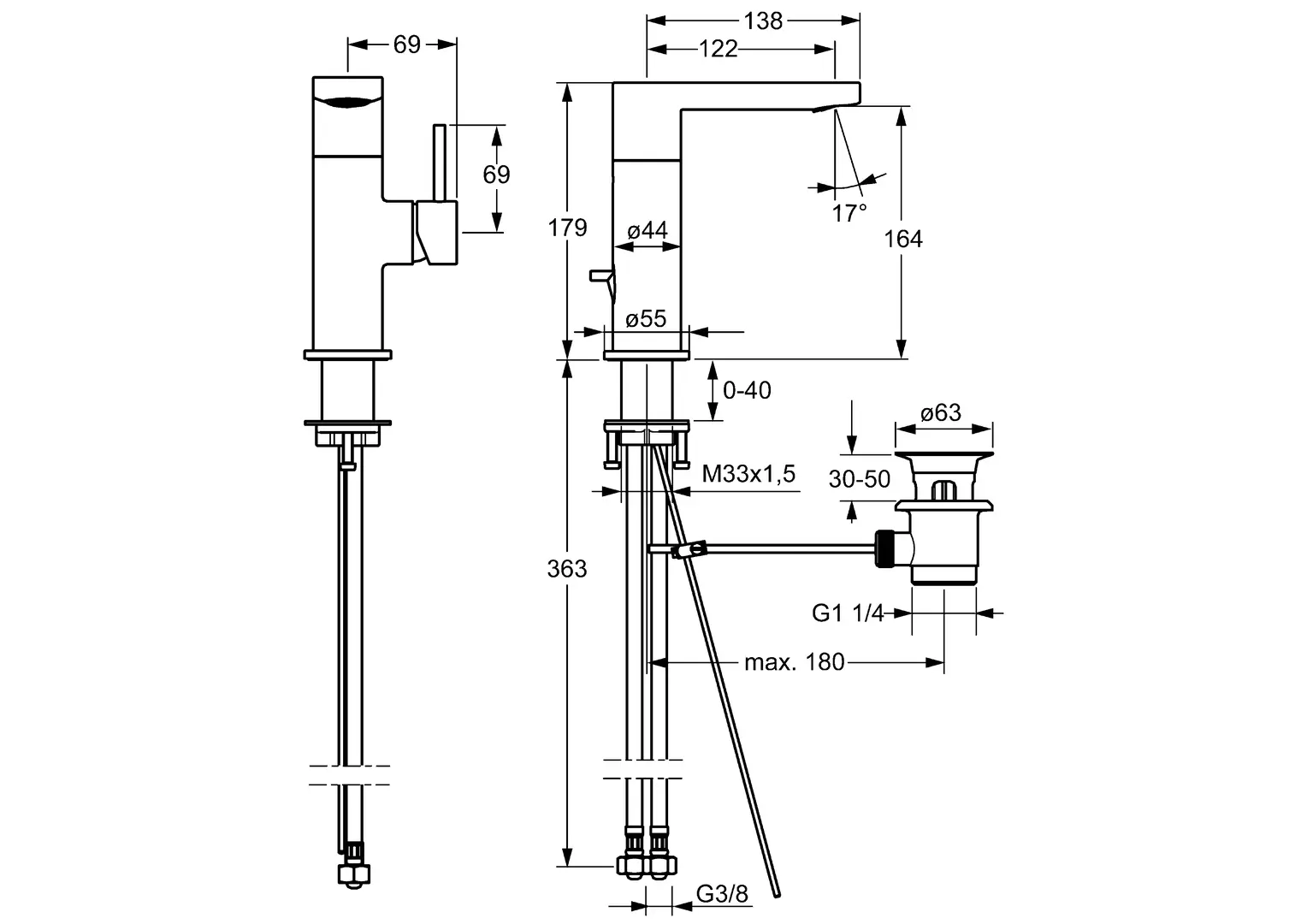 Vlastnosti Provzdušňovač PCA® aerátor s konstatním průtokovým množstvím nezávislým na změnách tlaku Připojení Flexibilní připojovací hadice Rozšíření Mechanický uzávěr odpadu s táhlem Páka/rukojeť Pin - ovládací páka s tyčinkou, Páka se symboly teplé a studené vody, Jedna ovládací páka / rukojeť Mechanické díly ø 25 mm keramická kartuše pro ovládání teploty a průtoku vody Speciální vlastnosti Tělo baterie z mosazi DZR Výtok Otočné výtokové rameno Barva Chrom Vlastnosti průtoku Průtok při 3 barech (s regulátorem průtoku) 6 l/min Technické vlastnosti Zabezpečení proti zpětnému toku (ČSN EN 1717) AA Velikost přípojky G3/8 Velikost DN (jmenovitý rozměr) DN15 Zdroj teplé vody max. +70°C Materiál Mosaz Projekce 122 mm Pracovní tlak 0.5 - 10 bar Předpisy Norma EN EN 817 Třída hlučnosti I (ISO 3822)