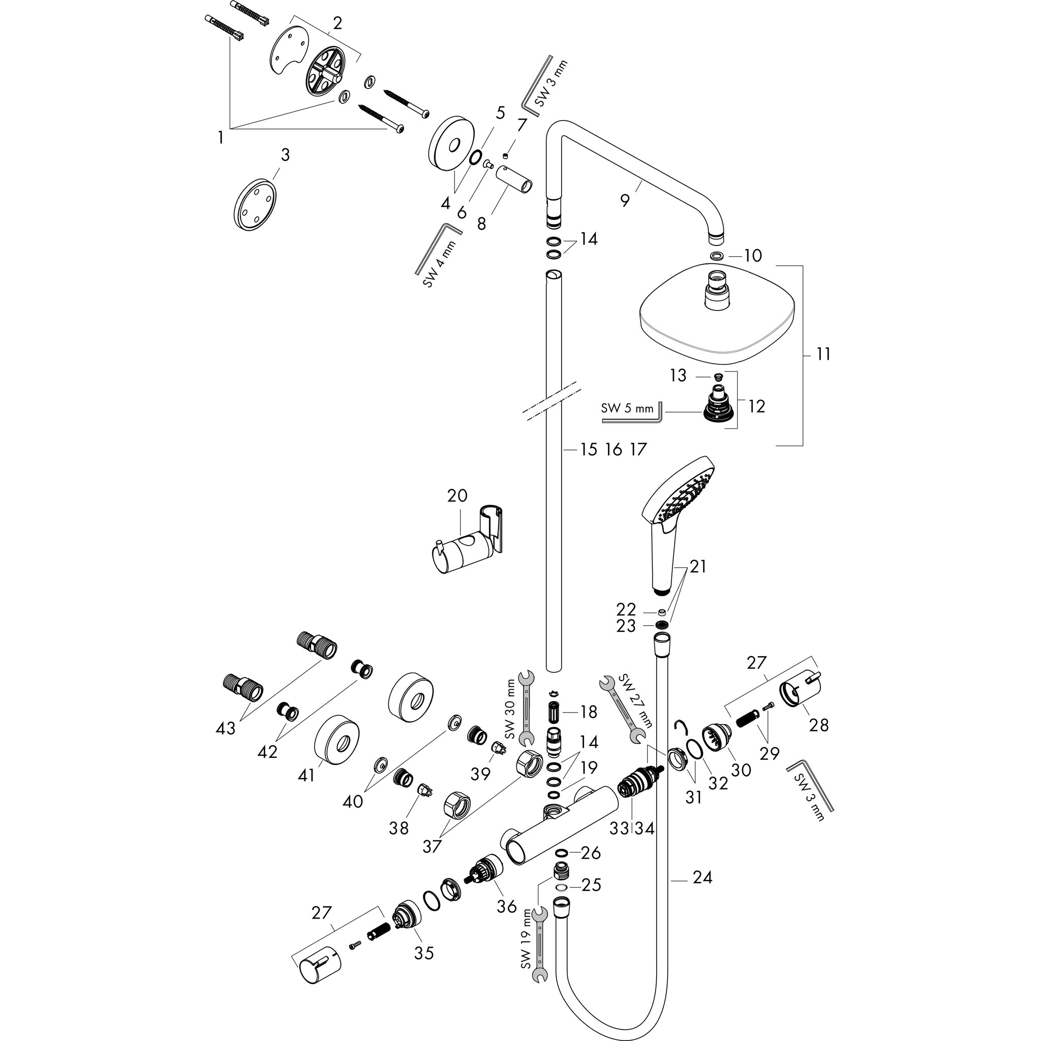 se skládá z: horní sprcha, ruční sprcha, sprchový termostat, sprchová hadice, držák ruční sprchy. Horní sprcha Croma Select E 180 2jet Velikost sprchové hlavice horní sprchy: 180 x 180 mm Typ proudu horní sprchy: Rain, IntenseRain Průtok proudu IntenseRain při 3 barech: 9 l/min Typ proudu ruční sprchy: SoftRain, IntenseRain, masážní proud Průtok pro ruční sprchu při tlaku 3 bary: 9 l/min Maximální průtok pro sprchovou trubku při tlaku 3 bary: 9 l/min Minimální průtokový tlak: 1,5 bar min. Provozní tlak: 1,5 bar Maximální provozní tlak: 10 bar Pohodlné přepínání typu proudu pomocí tlačítka Select Kulový kloub: hlavovou sprchu lze nastavit v úhlu Výškově nastavitelný držák ruční sprchy Délka sprchového ramene horní sprchy: 400 mm Otočné sprchové rameno: otočné sprchové rameno Termostat Ecostat Comfort Bezpečnostní pojistka při 40 °C Nastavitelný omezovač horké vody Lze použít pouze jeden spotřebič Vhodné pro průtokové ohřívače vody Typ montáže: Povrchová instalace Velikost připojení: DN15 Připojovací závit: G ½ Rozteč: 150 ± 12 mm Stoupací potrubí lze výškově zkrátit na požadovanou délku Jiskrově bezpečný proti zpětnému toku Průměr sprchové tyče: 22 mm 2 spotřebiče