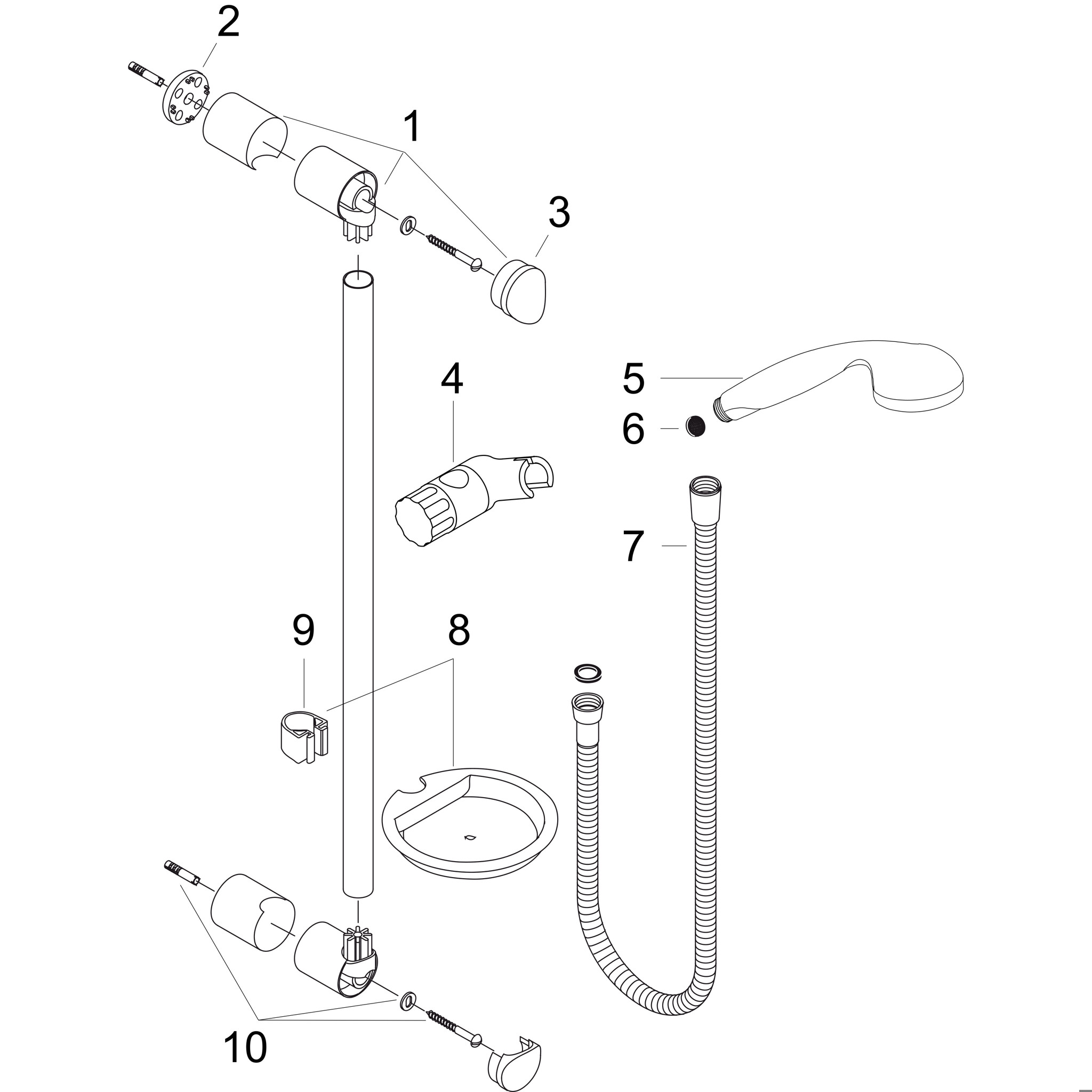 PopisNáhradní díly Popis se skládá z: Ruční sprcha, sprchová tyč, sprchová hadice, držák ruční sprchy, mýdlenka.QuickClean: usazeniny vodního kamene lze jednoduše setřít prstem.Maximální průtok při tlaku 3 bary: 13 l/minCelková délka sprchové tyče: 668 mm Náhradní díly