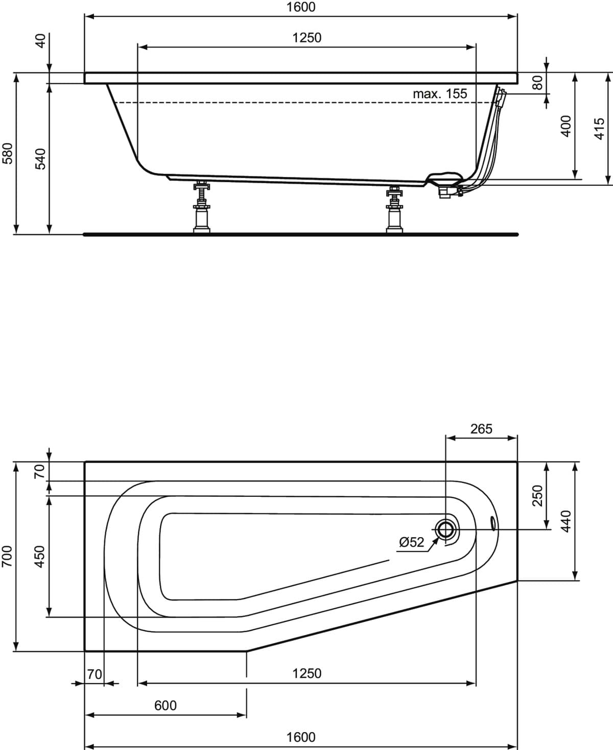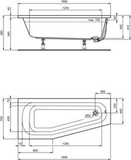 Typ: Prostorově úsporná vana Délka: 1600 mm Šířka: 700 mm Objem: 155 litrů Kolekce: Hotline New Schválení: DIN EN 263, DIN EN 14516, DIN EN 198, DIN EN 232 Výška: 465 mm Materiál: sanitární akryl Čistá hmotnost: 18,00 kg Tvar: asymetrický