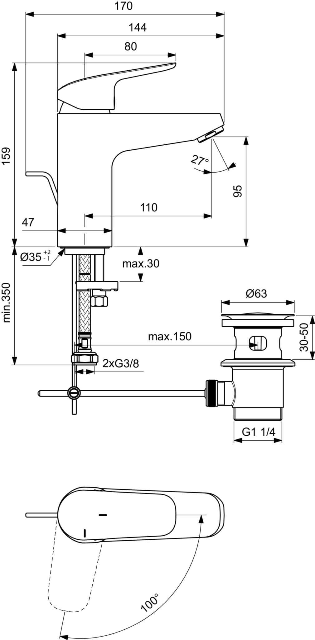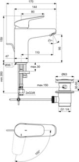 IDEAL STANDARD Umyvadlová baterie Ceraline bez vyskakovacího výtoku s prodlouženou základnou, průmět 150 mm #BC269AA - chrom
