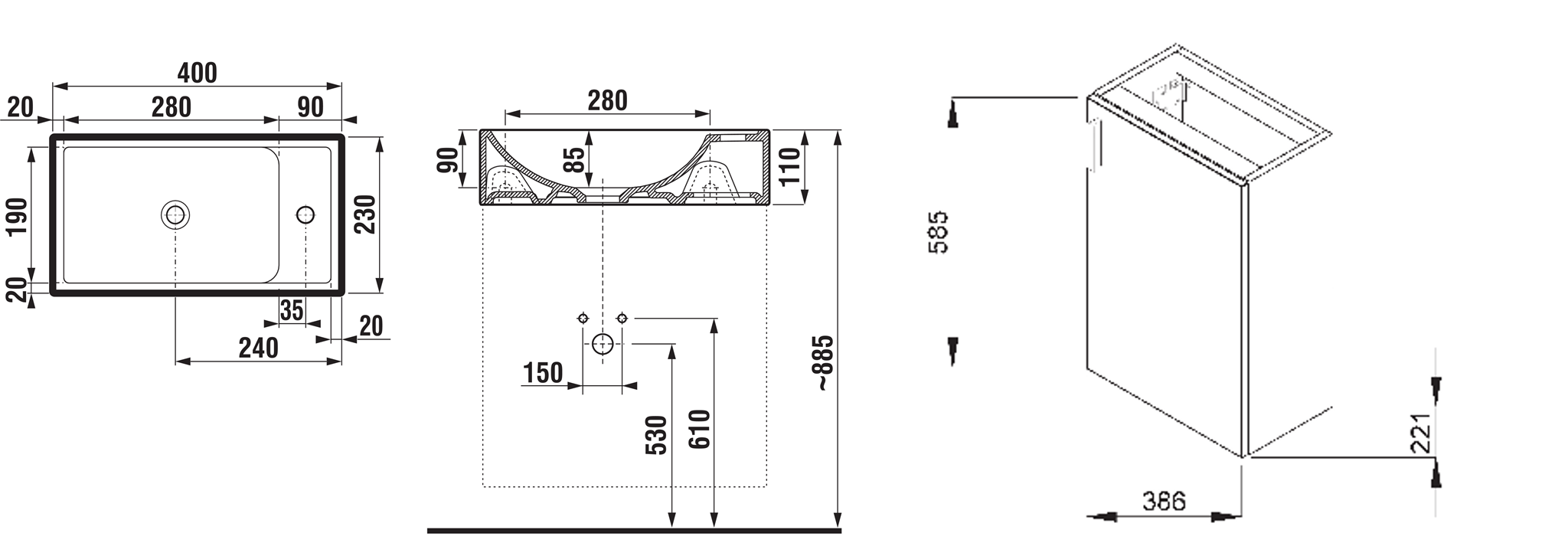 JIKA Petit, skříňka s 1 levo/pravými dveřmi včetně umývátka bez přepadu 40x23 cm, otvor pro baterii vpravo H4535111753001