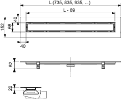 Rovné tělo žlabu pro instalaci do nátěru a pro poklad velkoformátové keramické dlažby / tabulí z přírodního kamene. S přírubou a těsnící páskou Seal System pro realizaci nezávisle testovaného spojení sprchovacího žlabu TECEdrainline s kompozitním těsněním. Složení: Tělo žlabu s přírubou z nerezové oceli, materiál 1.4301 (304) Těsnící páska Seal System s kašírováním pro instalaci pomocí tekutého nebo fóliového kompozitního těsnění zákazníkem Podpěrné nohy pro upevnění do stěrky nebo pro ukotvení volitelných montážních podpěr Středový spojovací díl pro napojení sifonu Vnitřní spádování pro zlepšení odtoku a samočisticího efektu Podpůrná rohož z nerezové oceli – materiál 1.4301 (304) – pro montáž do těla žlabu Těsnění Minimální instalační výška (bez dlažby) k hornímu okraji žlabu: 52 mm "vertikální" sifon 61,5 mm "ultra-nízký" sifon 87 mm "snížený" sifon 112 mm "standard" sifon 140 mm "max" sifon Viditelné rozměry žlabu po montáži délka x šířka: (L - 87 mm) x 68 mm Šířka kolem roštu pro odtok: 6-8 mm (viz výkres napravo) Objednávejte prosím zvlášť: Sifon Montážní podpěry (volitelné) Zvukovou izolaci Drainbase (volitelné), splňuje požadavky německých protihlukových norem DIN 4109 a VDI 4100 úrovně (SSt) I až III Poznámka: U provedení roštu "plate II" je možné vyrobit atyp, všechny ostatní typy roštu (žlab pro nalepení dlažby, skleněný povrch, designové mřížky) už nejsou vhodné!