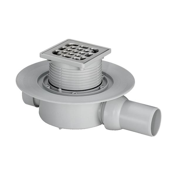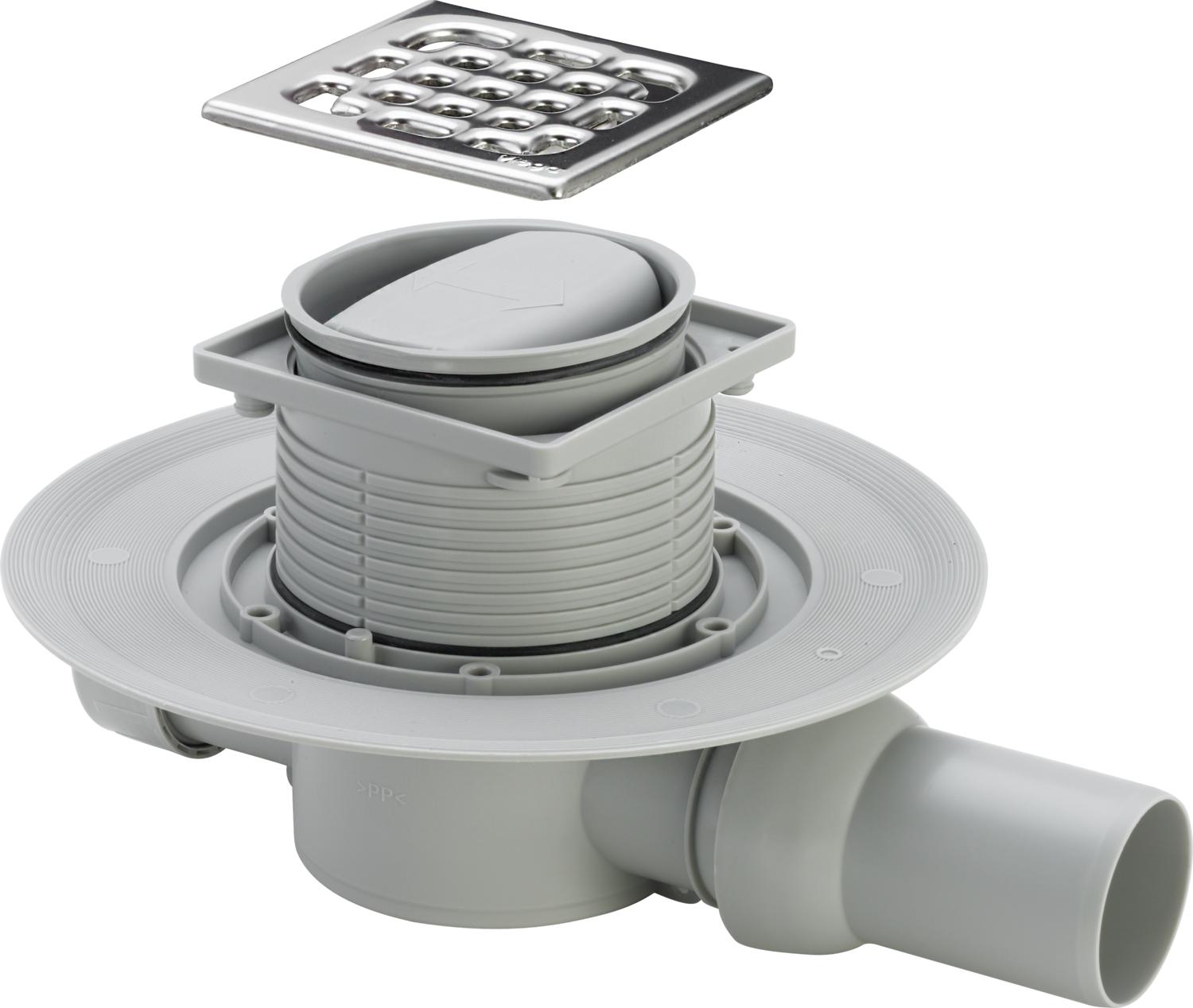 Vybavení otočný a výškově nastavitelný nástavec 100 x 100 mm, zátka, rošt z ušlechtilé oceli 1.4301, utěsňovací příruba, vyjímatelný zápachový uzávěr, přítok DN40, odtoková trubka s kulovým kloubem